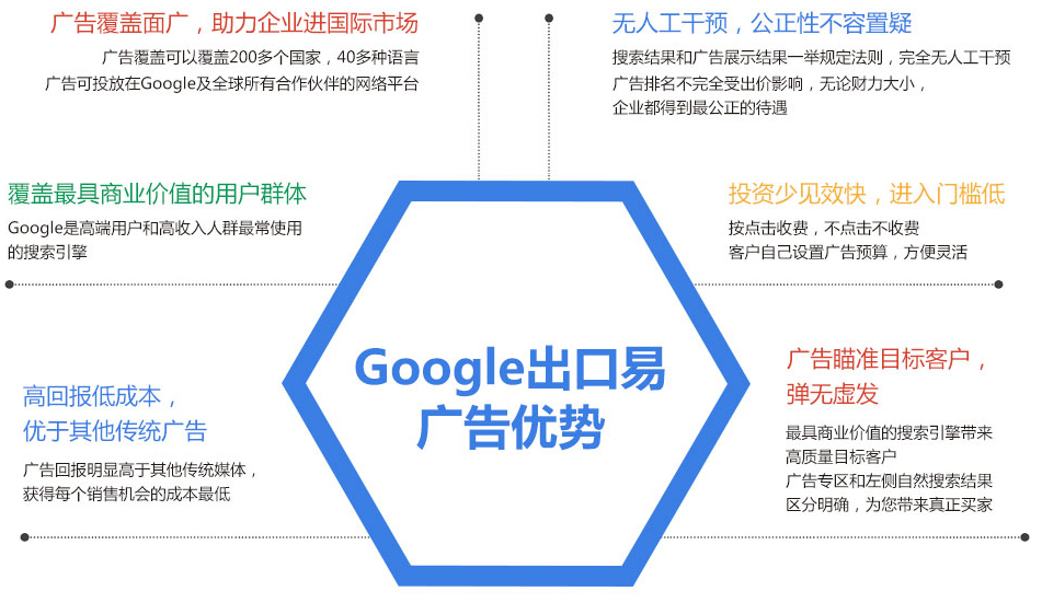 Google AdWords 关键字广告出口易计划,是Google(谷歌) 极其正式授权代理商为满足出口贸易企业海外推广需要而推出的英文关键字广告计划。传统广告、展会等企业没有看到效果前就必须大笔投入。Google AdWords 关键字广告出口易计划,仅以广告被点击次数收费,展示免费。前期投入成本低,且每一分钱都花在潜在客户身上。